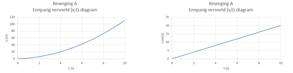 Beide A diagrammen geven een eenparig versnelde beweging weer. Vergelijk het s,t-diagram van beweging A maar eens met beweging A van Figuur 1. Je ziet dat de hardloper in Figuur 1 in dezelfde tijd steeds meer afstand aflegt. Dit komt doordat de snelheid van de hardloper iedere seconde toeneemt met een bepaalde waarde. Dit is terug te zien in beide diagrammen van beweging A. Bij het s,t-diagram zie je een steeds meer stijgende lijn, bij het v,t-diagram zie je een rechte stijgende lijn. Dit is kenmerkend voor een eenparig versnelde beweging.