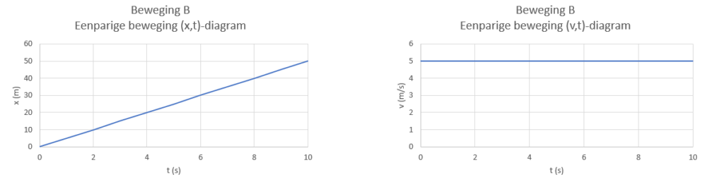 Bij de diagrammen van beweging B zien we een eenparige beweging. De afstand neemt gelijkmatig toe en de snelheid blijft constant. Als we het s,t-diagram van beweging B vergelijken met de bewegingen in Figuur 1 zien we dat de hardloper in Figuur 1 in dezelfde tijd steeds dezelfde afstand aflegt. Dit is terug te zien in de diagrammen van beweging B.