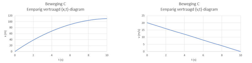 Als laatste hebben we de diagrammen van beweging C. Hier zien we een eenparig vertraagde beweging. Als we het s,t-diagram van beweging C vergelijken met beweging C van Figuur 1 zie je dat beweging C in dezelfde tijd steeds minder afstand aflegt. Dit komt doordat de snelheid van de hardloper iedere seconde afneemt met een bepaalde waarde. In diagram C zien we dit ook weer terugkomen. Bij het s,t-diagram zie je een steeds minder stijgende lijn, bij het v,t-diagram zie je een rechte dalende lijn. Dit is kenmerkend voor een eenparig vertraagde beweging.